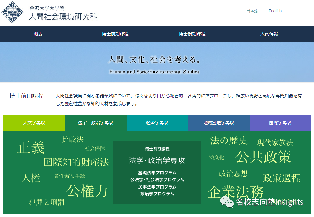 金泽大学法学专业最早可追溯至1881年,纵观其法学硕士课程的演变,可谓是“命运多舛”。法学研究科修士课程则创设于1971年,在2006年,法学研究科被并入该大学的人間社会環境研究科,后于2020年度再次复活为法学研究科法学・政治学専攻。