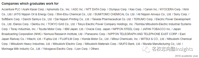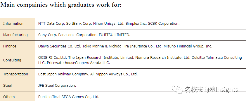 除了继续进行博士课程,学生们的进路非常广泛,就职方面则以情报通讯和咨询行业为主遍布各种日系大手公司。