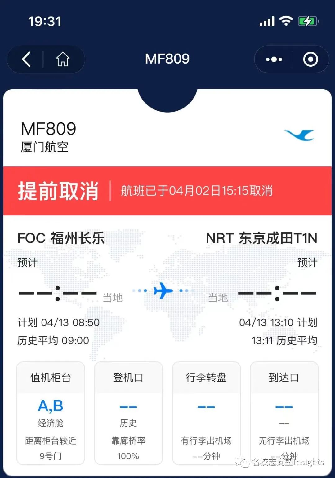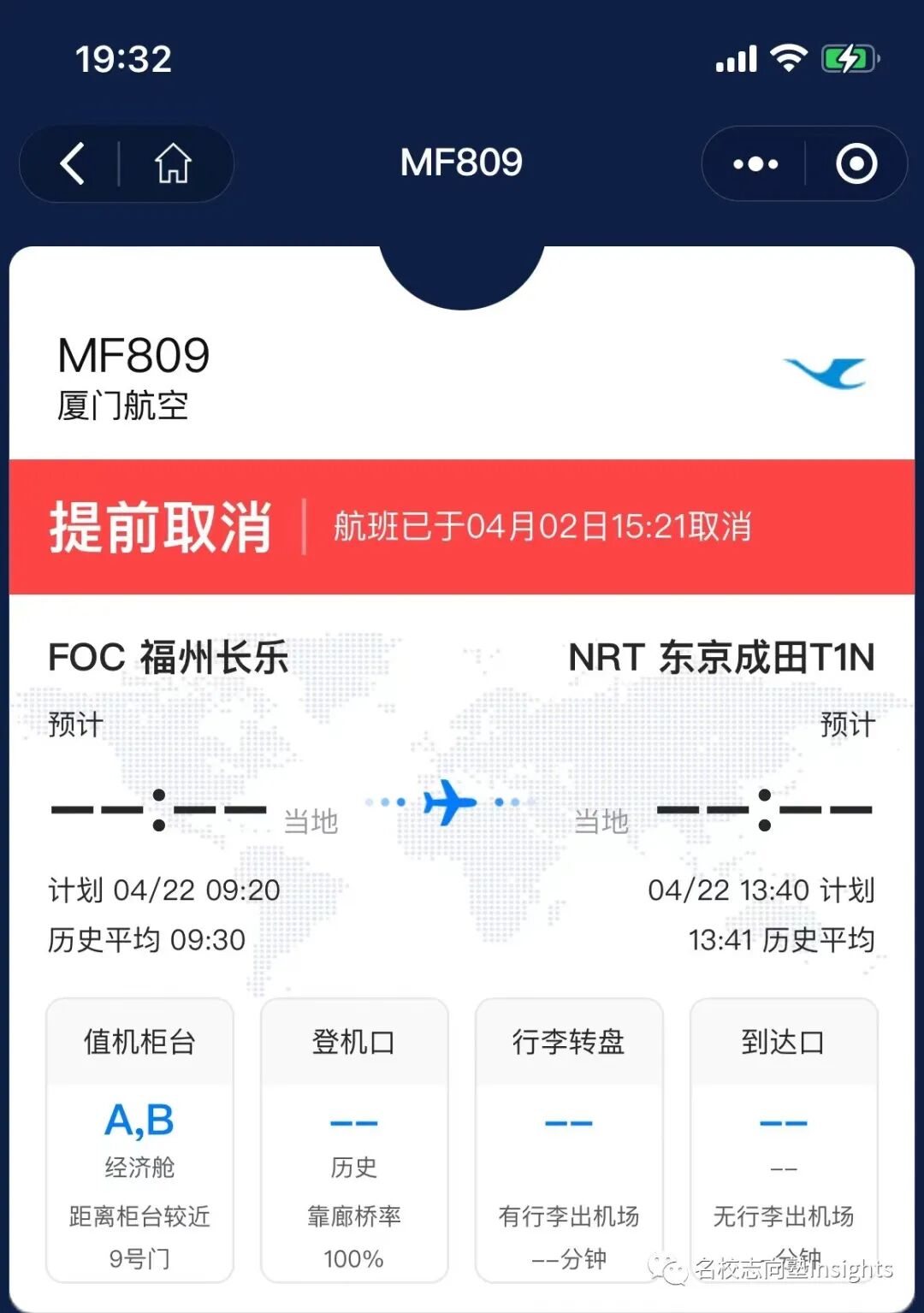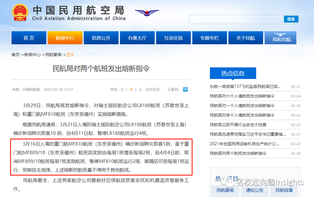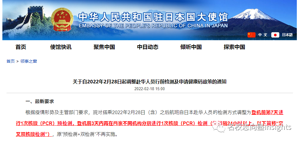 现在我们来一个一个解析上面三种看起来有点糟糕的情况—— 1. 首先,通过南航赴日的乘客短时间受到的影响较大。毕竟目前的状况是不仅东京→沈阳的飞机停飞,还有多班周四的沈阳→东京的航班被取消,而周三东京往返广州的航线是直接被停掉了,所以4月能通过文部科学省优化入境政策乘坐南航飞机返日的同学可谓极少; *来自“飞常准”APP 2. 厦航熔断相关变数可谓最大,毕竟经过核查除东京→福州飞机停飞外还有多班福州→东京飞机受牵连,且熔断期满到底恢复周三还是周五的飞机目前官方也毫无定论,所以4月能通过文部科学省优化入境政策乘坐南航飞机返日的人数未知: 3. 日航飞机目前所受的影响最小,因为据目前政策来看将于4月8日加入优化入境计划的周五大连→东京的航班并未受到本次熔断牵连。可以从大连飞的小伙伴们冲鸭—— 4. 以及隐含的第四点:除了被熔断的航班,文部科学省还为大家提供了很多别的航班可选哦 受到航班熔断的影响,之前已完成的PCR交叉检测因日期影响很有可能会作废。请需要调整航班的小伙伴务必注意最新政策所规定的PCR检测有效期: 根据2月18日中国驻日本大使馆发布的通知,自2022年2月28日起,搭乘航班自日本赴华人员的检测方式已由“登机前第7天的预检测+登机前48小时内的双检测(核酸PCR+血液检测)”调整为“登机前第7天进行1次核酸(PCR)预检测,登机前3天内在两家不同机构分别完成1次核酸(PCR)检测(须间隔24小时以上)”。 在入境情况千变万化的当下,还未入境的小伙伴请加快入境的脚步,速度点击下方名片关注名校志向塾Insights并于后台回复“优化航线”领取内部资源吧——