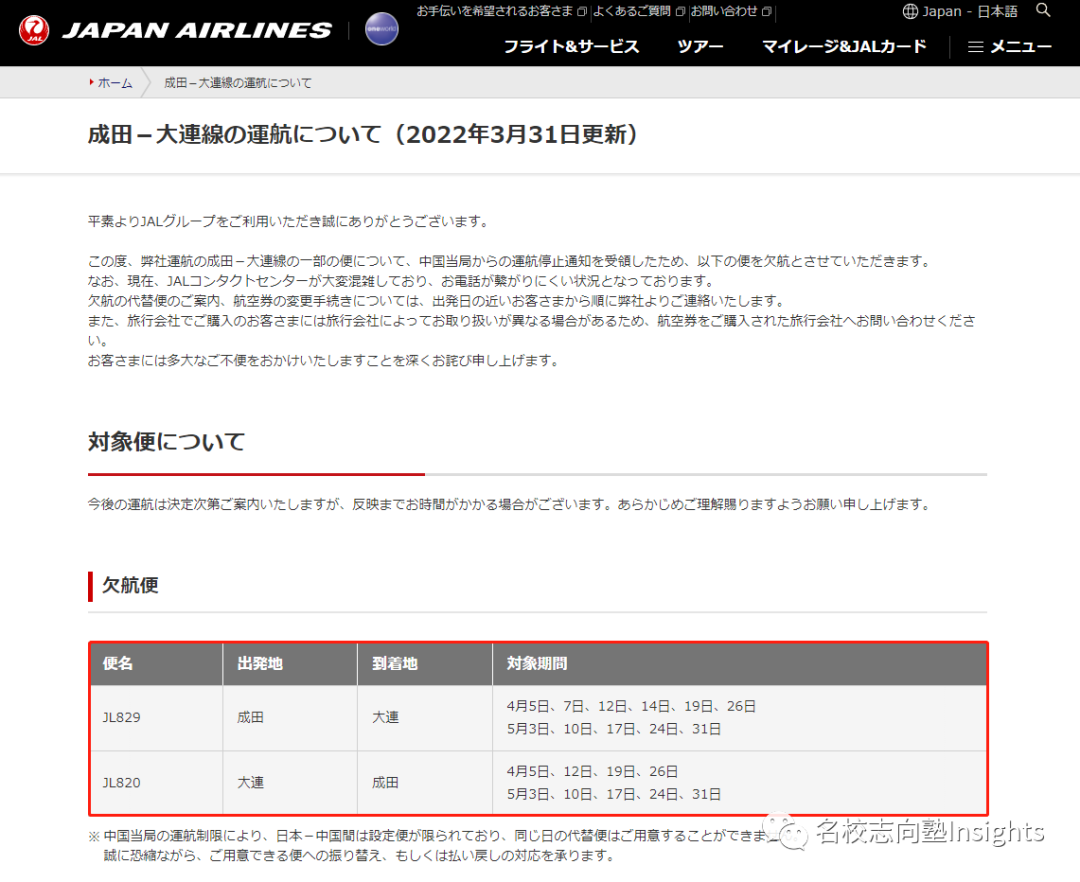 日航往返东京-大连的航线似乎也遭遇了熔断……