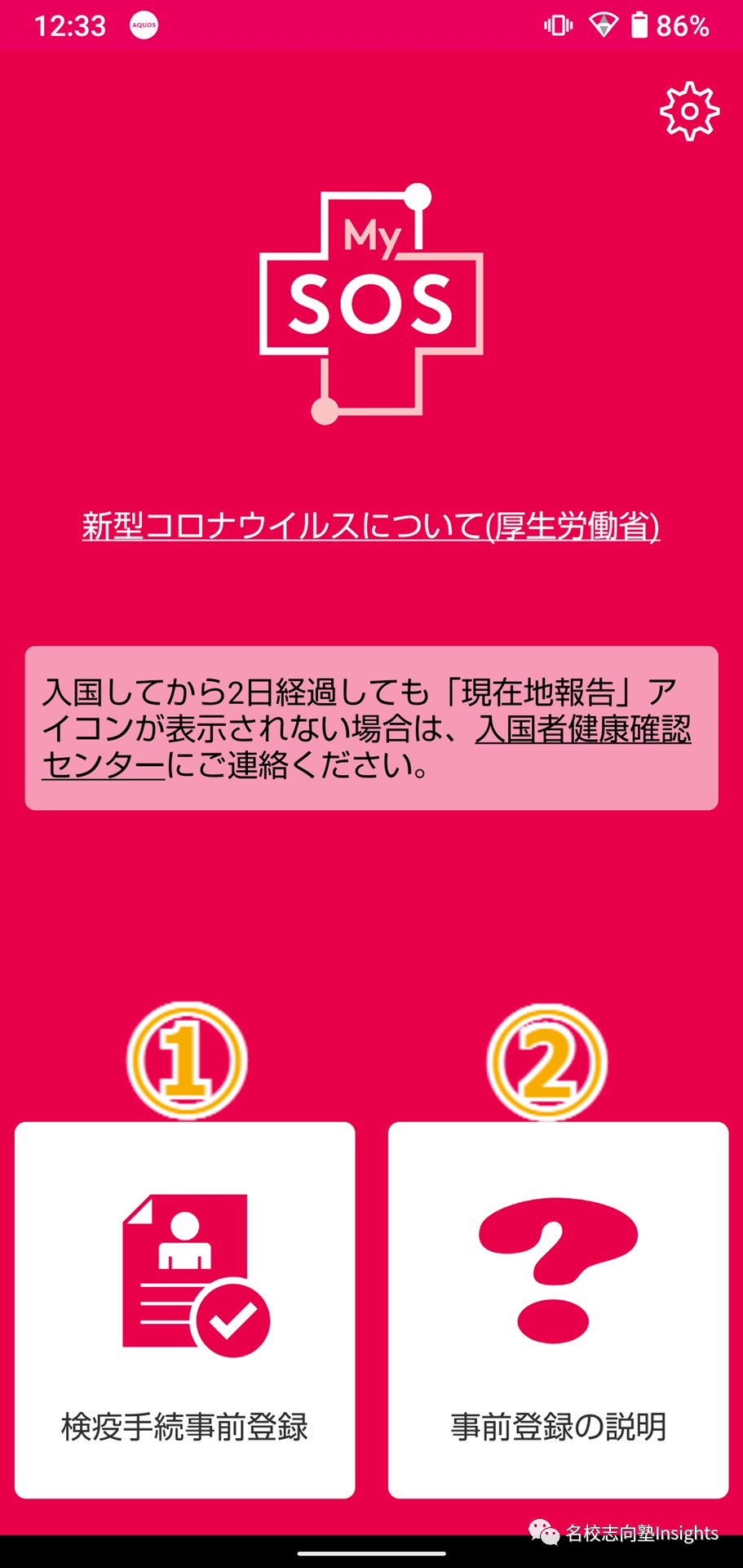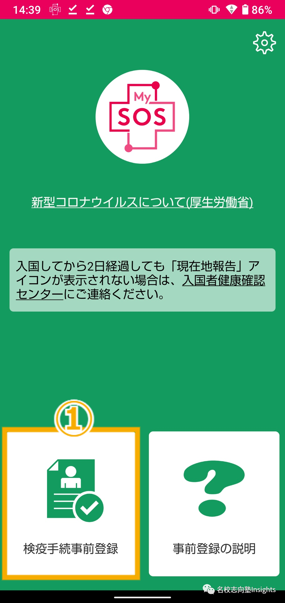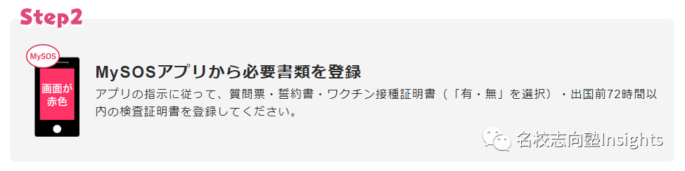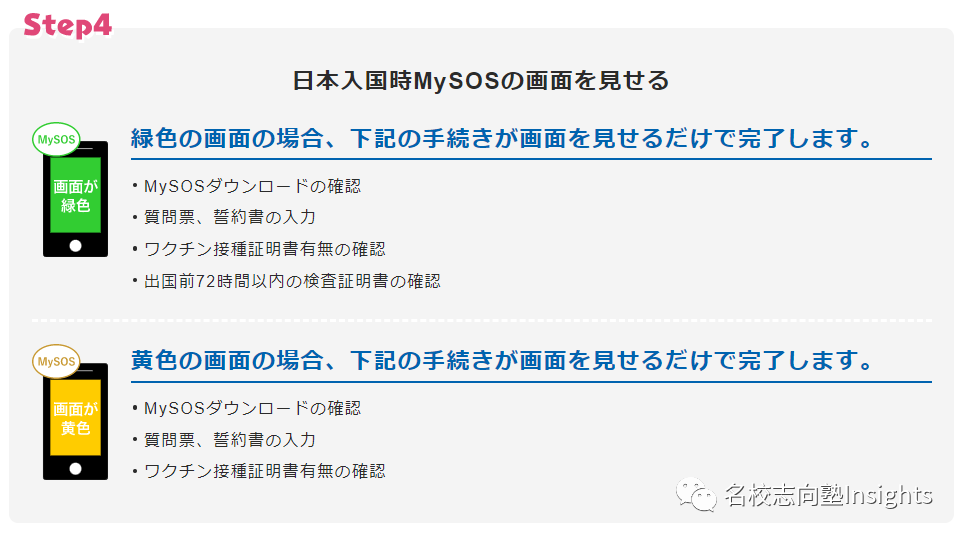 下载完成后,需要按应用程序所指示的步骤提交提问表、承诺书、疫苗接种证明书及检测证明书四项材料。 其中如果材料齐全,则画面会变为绿色; 未提交检查证明书,则画面为黄色; 如果其他申请所需的资料不全,则画面为红色,该情况下需重新提交材料并完成申请。 只要在机场向检疫人员出示页面即可免除部分手续。具体如下: *需注意画面为黄色也可以减免部分手续,但除MySOS界面外,还需在检疫处出示取得的纸质检测证明书。 (名校志向塾 VAN · ????????) 同学们有任何入境或学习生活的问题,都欢迎进一步咨询名校志向塾