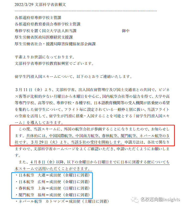 3月11日,文部科学省宣布将与出入国在留管理厅及国土交通省联手,充分利用周一至周四这样商务旅客比较少的日子,与我国中国国际航空、中国南方航空、春秋航空及厦门航空四家航空公司自3月29日起携手促进本次大幅开放的留学生入境⇣⇣⇣
