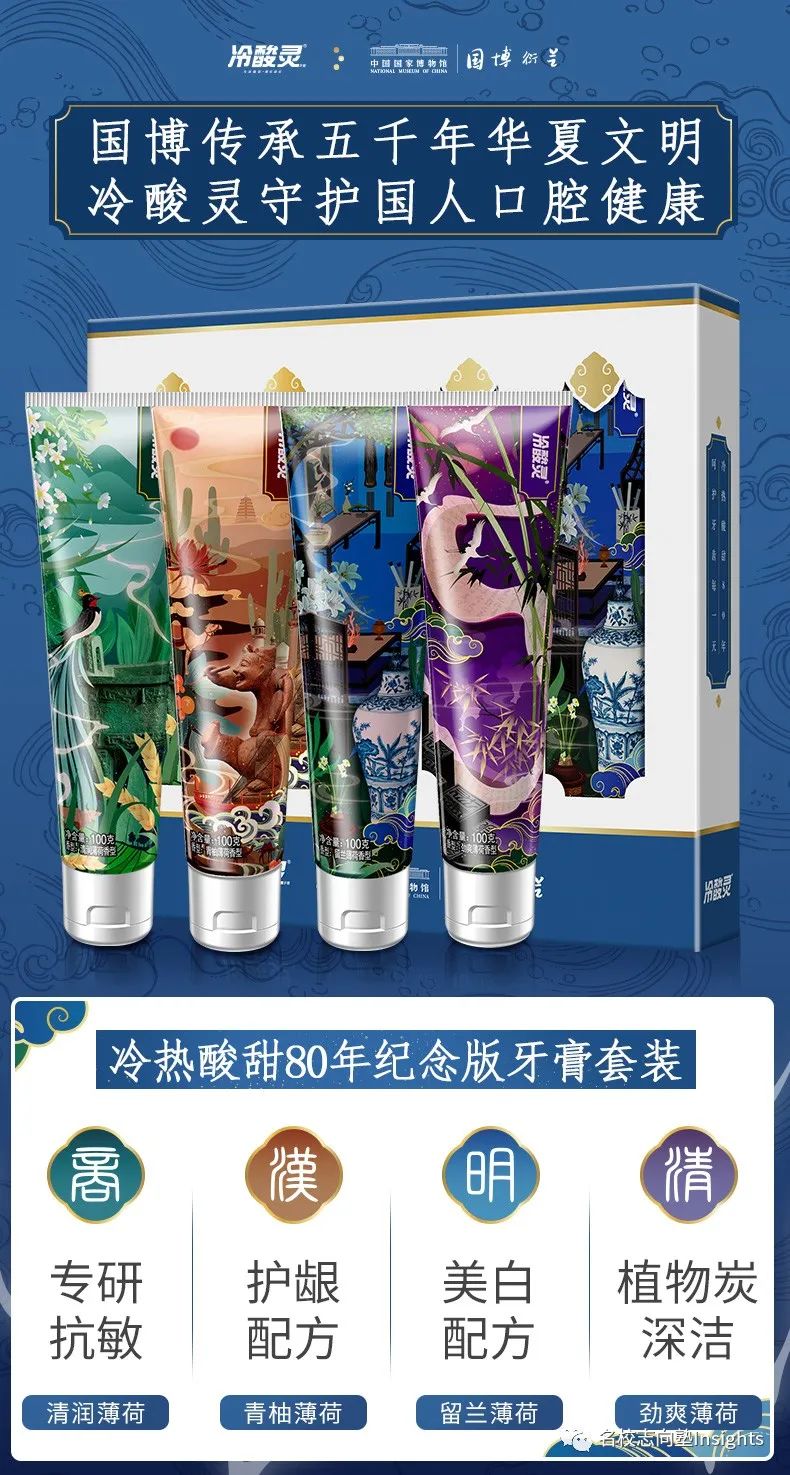 作为经典国货,冷酸灵自然也承担起了弘扬中华传统文化的社会责任,和中国国家博物馆推出了联名纪念款,以国家博物馆中所藏的商、汉、明、清4个朝代的文物为灵感,赋予了牙膏超越其本身的价值(学习经营学的小伙伴请复习“価値創造”)。