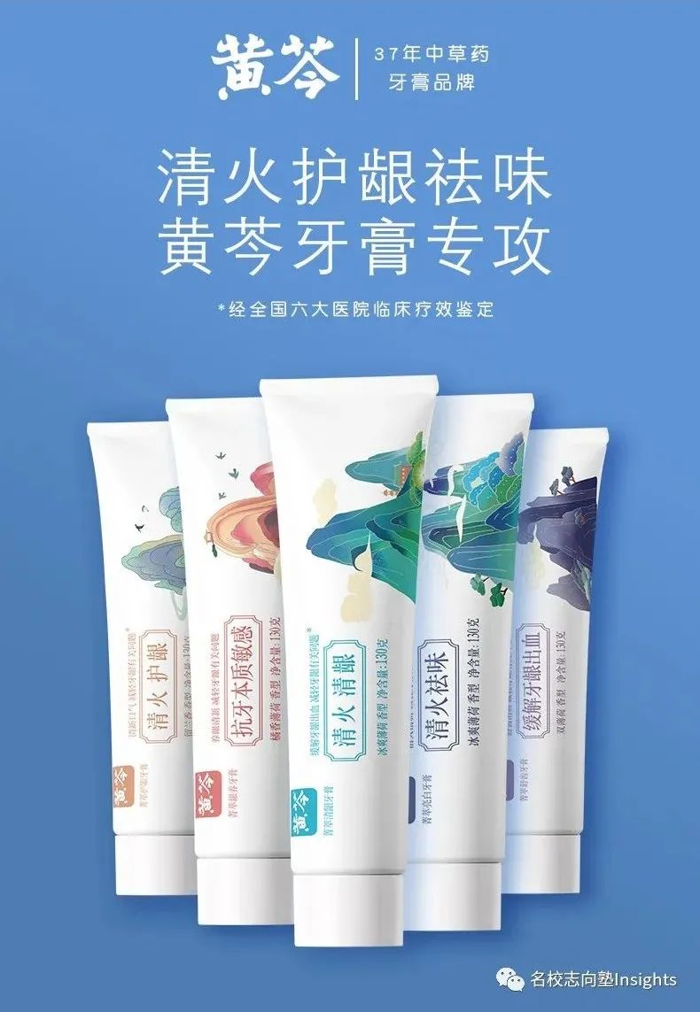 比如说上文中例举的黄芩,就推出了“中医清火”系列,牙膏本身虽一直贯彻“中草药成分解决口腔问题”这一理念,但在包装上肉眼可见地变得更加符合当下的审美潮流了。