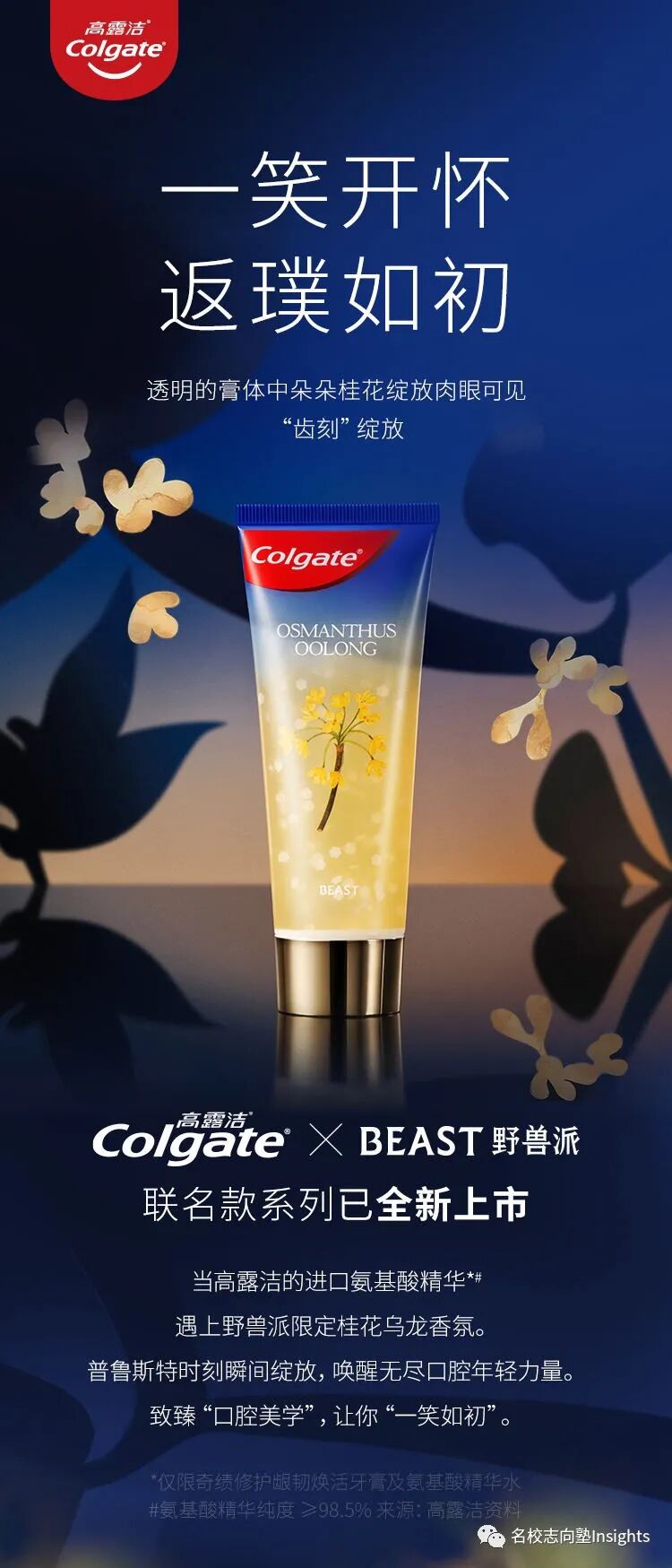 高露洁还曾和野兽派推出联名款桂花乌龙香氛牙膏,让人用后唇齿留香。