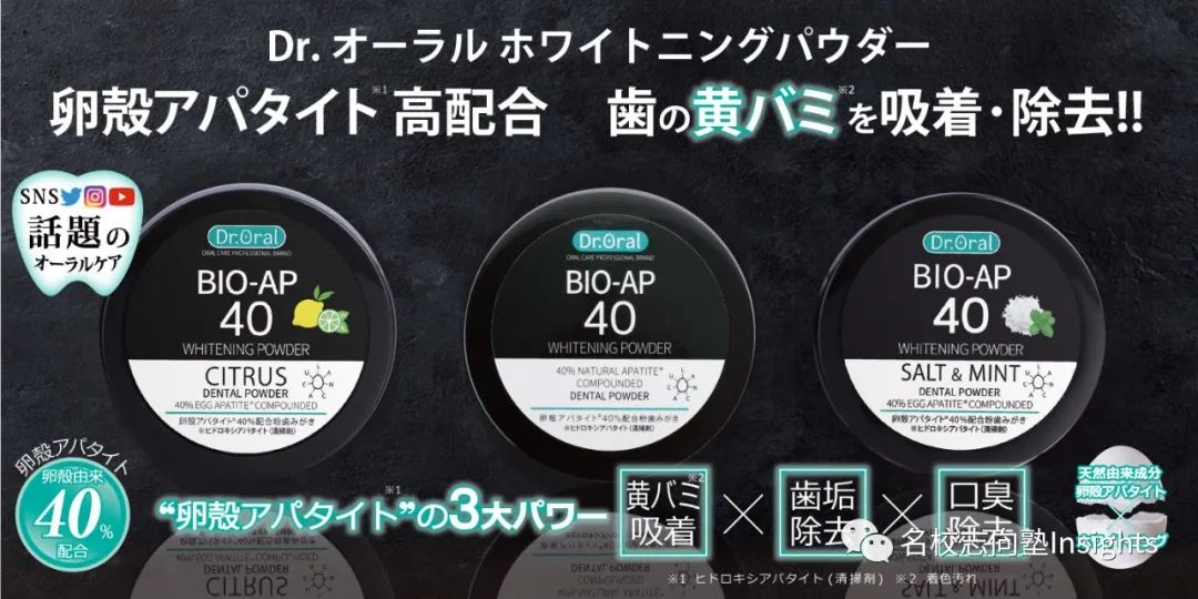 Dr.Oral也是不得不提的一大品牌,制品虽少,但基本上可以说是把制品开发的全部重心都放在了“美白”上,其旗下的美白牙粉更是在各色社交媒体上引起热议(小编曾跟风购买,但因为每次刷牙都被牙粉呛到而放弃使用),共有无香、柑橘香、盐香薄荷3种香型,定价则为1430日元,算是比较贵了。