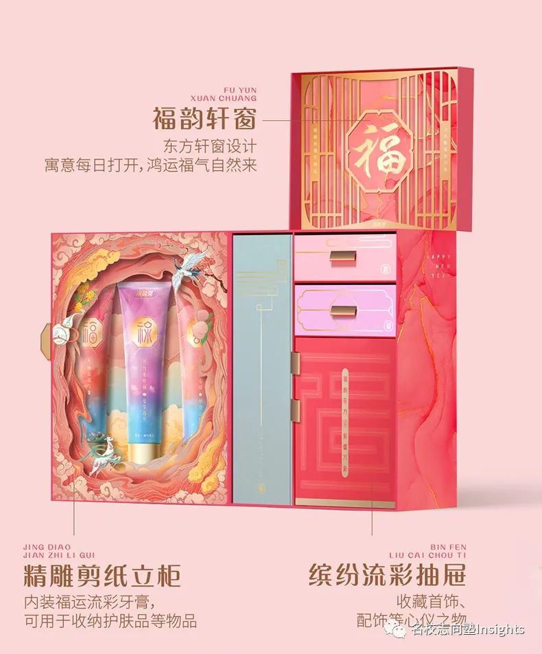 比如说,今年新年推出的新春福禄寿福运流彩牙膏礼盒更是让人耳目一新,礼盒本体的设计融入了众多中国传统元素,似乎是以古代的梳妆台为参照设计的。