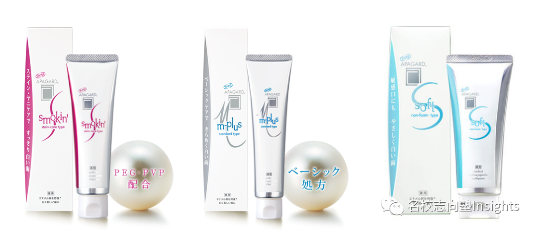 最后,我们来看看APAGARD,该品牌的牙膏也同样特化美白功效,并针对不同成因的牙齿暗黄推出了soft(低刺激配方面向牙齿敏感人群)、M-plus(基本款,薄荷香)、smokin(用于去除烟、酒、茶、咖啡等造成的牙渍)、premio(高级配方)、premio extra mint(高级配方+超强薄荷)等多种分类。