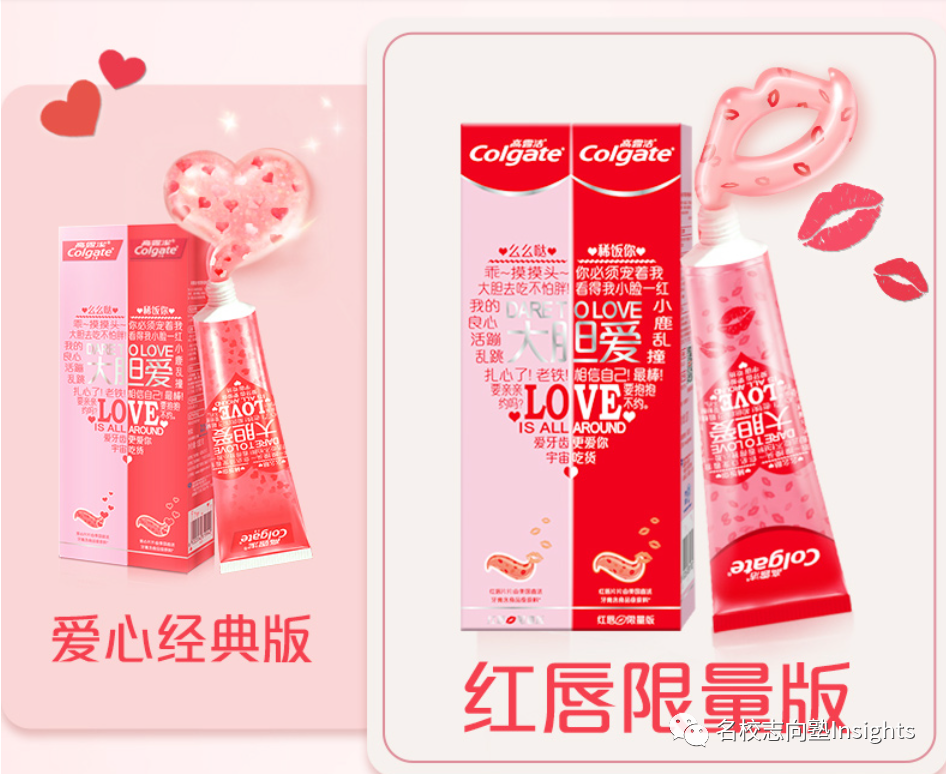 在亮片内卷上把“登(li)峰(pu)造(dao)极(jia)”发挥到极致的当属高露洁,其推出的大胆爱限量版牙膏在包装盒设计上就让人浮想联翩,同时还在外盒上设置了手写留言的板块,可谓是实用主义者的情人节送礼必备。