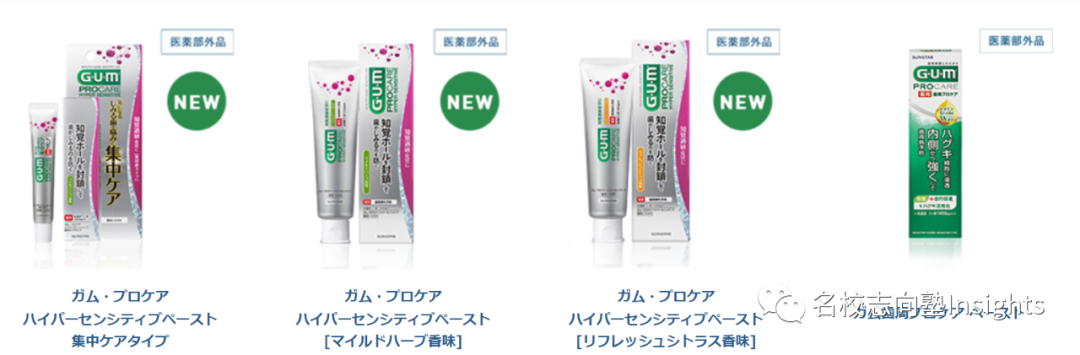 G・U・M的牙膏主要以药用为主,因此功效基本限定在治疗或预防牙周炎/牙龈炎、牙齿敏感、口臭,并没有推出主打美白效果的产品。