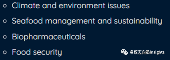 气候和环境问题、海鲜管理和可持续性、生物制药以及食品安全。