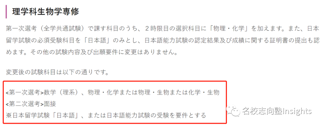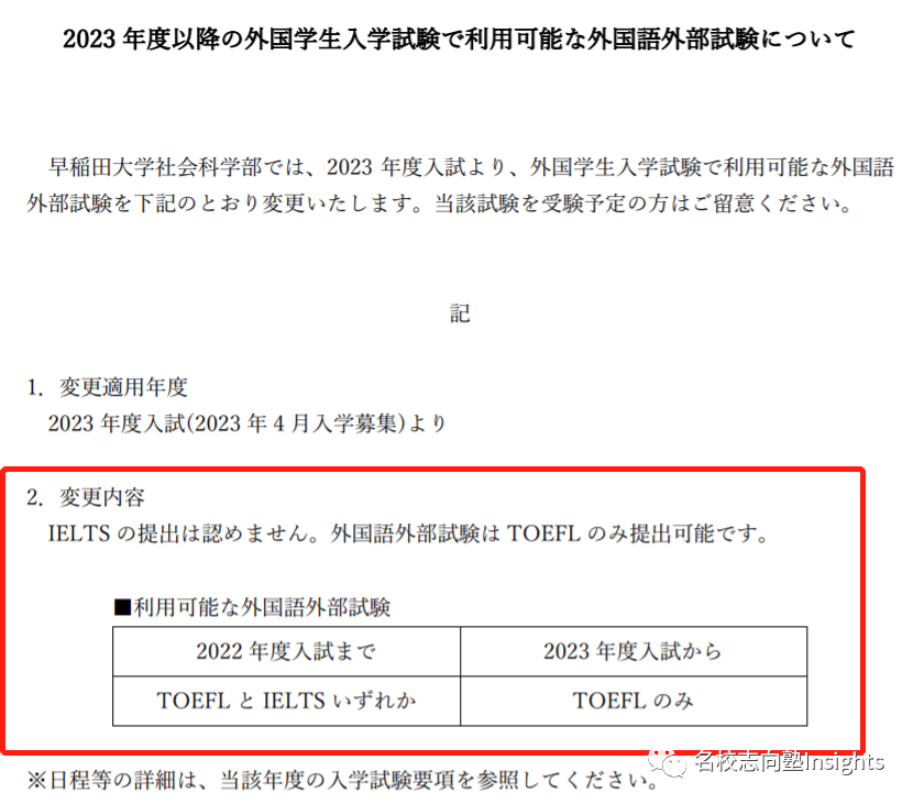 教育学部理学科生物学専修 变更前:第一次选考(物理・生物or化学・生物+理科数学)+第二次选考(面试) 变更后:第一次选考(物理・化学or物理・生物or化学・生物+理科数学)+第二次选考(面试) *理学科生物学专修变更点 自2023年度外国学生入试起,社会科学部将不再接受雅思成绩,只接受托福成绩。 *社会科学部可用英语成绩变化通知 以上就是本期关于2023年度早大外国学生入试变更点的速递,报考细节请以入试要项为准,也请期待名校志向塾Insights的出愿TIPS系列。 (名校志向塾 ビオラ) 同学们有任何入境或学习生活的问题,都欢迎进一步咨询名校志向塾