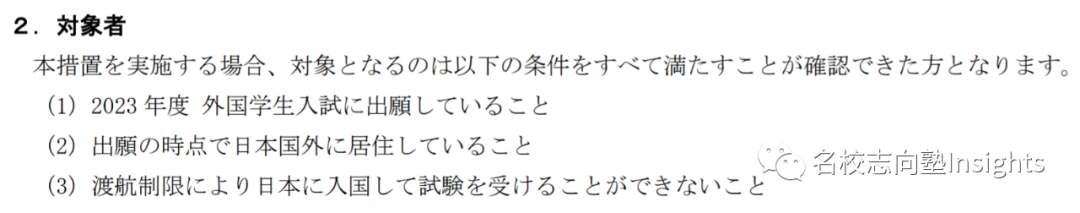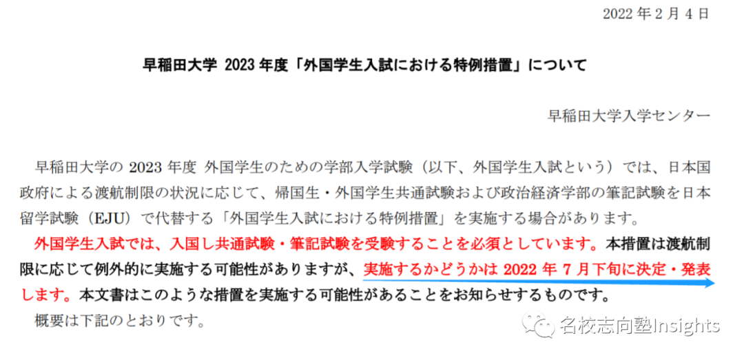 2月4日,在官网公布的题为“早稲田大学 2023 年度「外国学生入試における特例措置」について”的通知中,大学方面表示:受疫情影响无法来日的考生可申请特别举措,通过该举措,考生可提交留考成绩代替校内考。