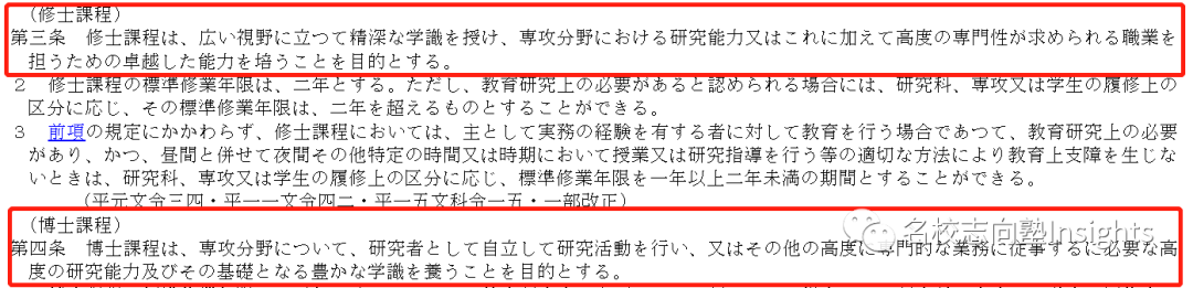 根据日本学校教育法、大学院設置基準第三条、第四条规定,大学院修士课程、博士课程的目的如下: