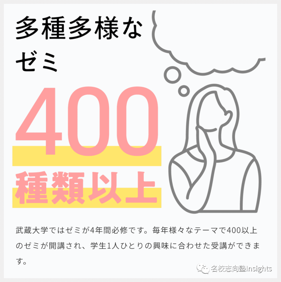 不得不说,在文科教育上,小而精的武藏大学应该是做到了极致。目前,武蔵大学拥有経済学部、人文学部、社会学部三个学部,以及相关研究科。在2022年4月,还将加入新学部国際教養学部。而在学部生+大学院生+全体教职工仅有5000余人的校园里,每年开设的个性化seminar就高达400种以上,不管你有什么稀奇古怪的求知需求,没有ゼミの武蔵教不了的doge