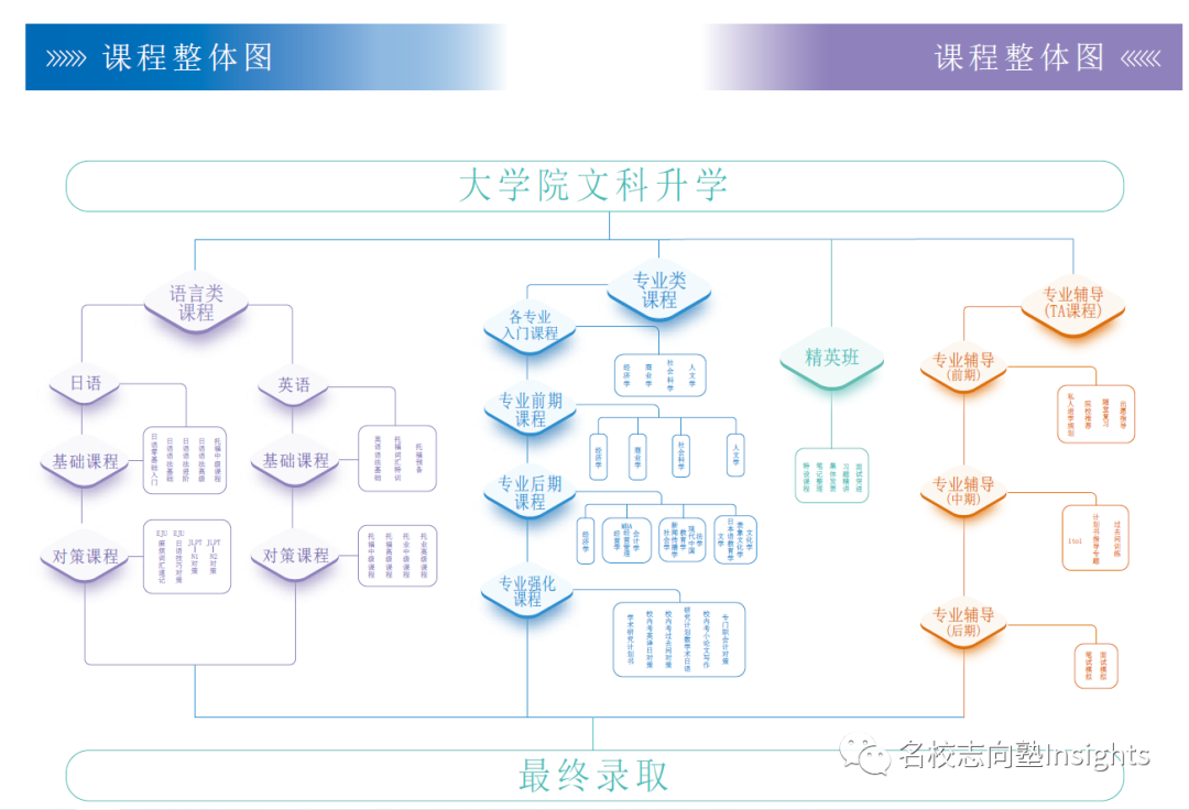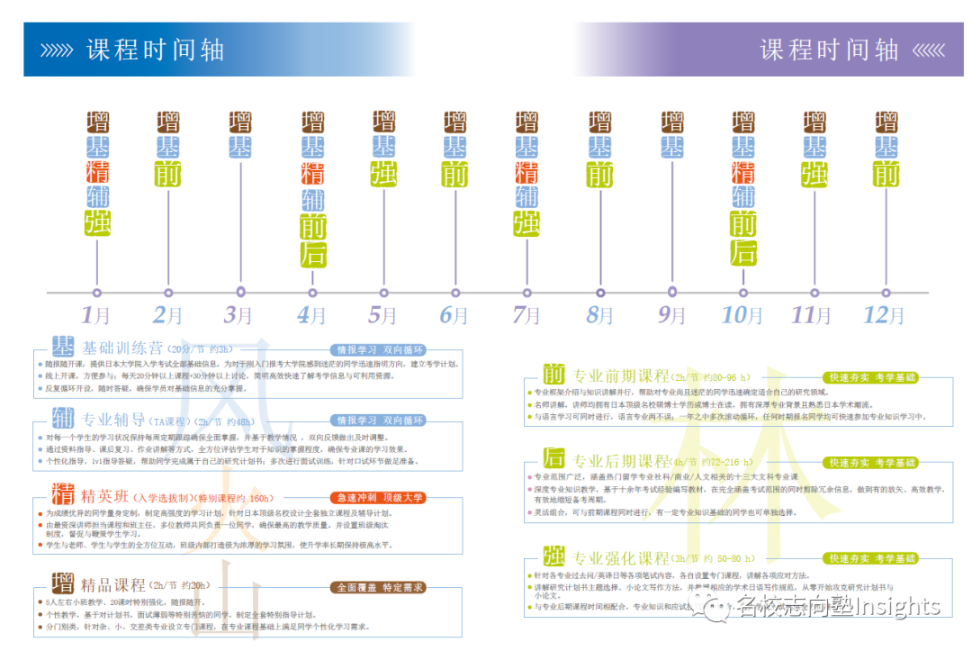 名校志向塾大学院文的精品课程体系包括语言课、专业课程、精英班、专业辅导四大方向: