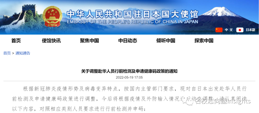根据中国驻日本大使馆于2022年5月19日发布的“关于调整赴华人员行前检测及申请健康码政策的通知”,将对从日本出发赴华的人员的行前检测和申请健康码政策进行调整。