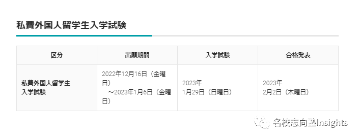 目前,该校全学部面向留学生开放招生。虽说2023年度的具体募集要项尚未公布,但出愿与考试日程已经决定,如下图所示: