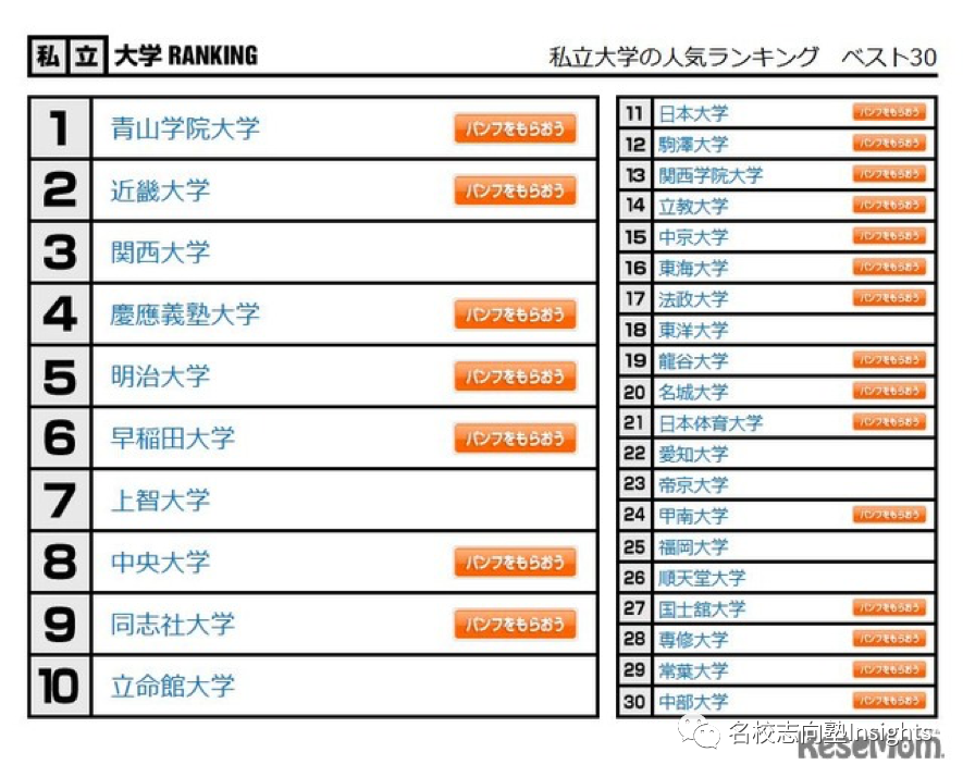 在历年的大学人气投票中,青学从未跌落神坛。最新的「私立大学の人気ランキング ベスト30(2022年)」显示,青学毫不意外地又双叒叕登顶第一位。至于理由,如此おしゃれ且高偏差值(简称颜好气质佳学习成绩优秀)的青学,受到高中生们的神话和热捧几乎是毫无疑问的。