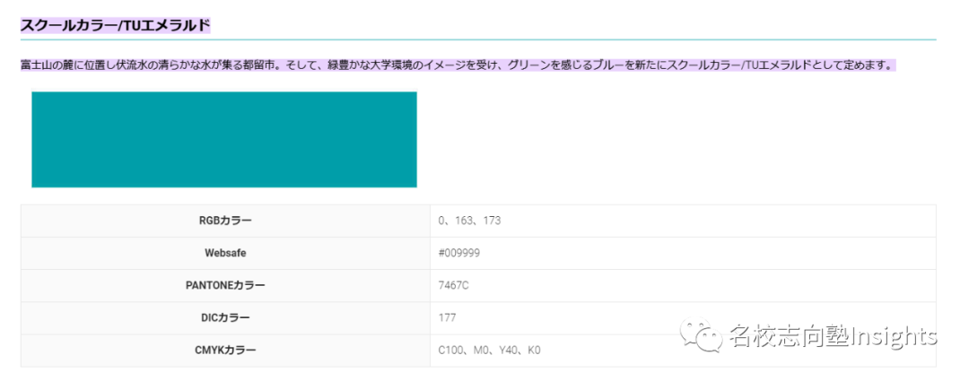 都留的官方代表色使用这种青也算是因地制宜。作为富士山麓著名的观光都市山梨县都留市的公立大学,穿境而过的富士山泉既是文化的根源,也是极具魅力的宣传符号。