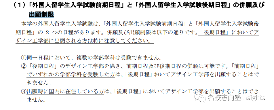 ②报考前期日程中任一学部的考生,不能报考后期日程的デザイン工学部,其它学部允许前后期并愿。
