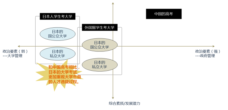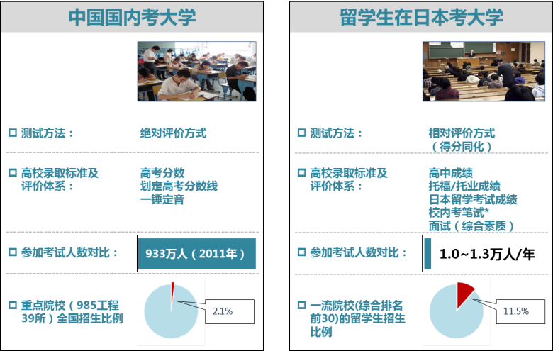 高考与日本留考比较除了具体考试内容、题型及评分方法的区别之外,留考一年两次,而高考一年只有一次。与中国高考的“一考定终身”相比,留考成绩算是大学的第一个门槛,而各个大学的校内考及面试也极其重要。目前,高考参考人数逐年下降,而本科出国留学人数却逐年增多。国内重点院校的全国招生比例为2.1%,然而日本一流院校的留学生招生比例为11.5%,因此在日本考大学相对国内来说,升学率更高,考入名校的机率更大。