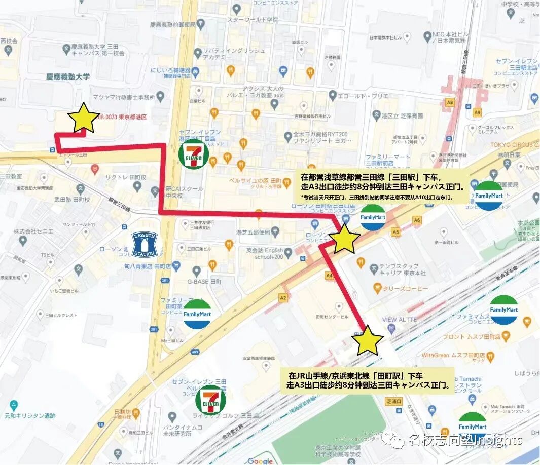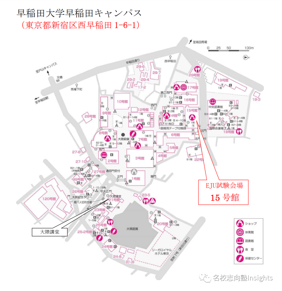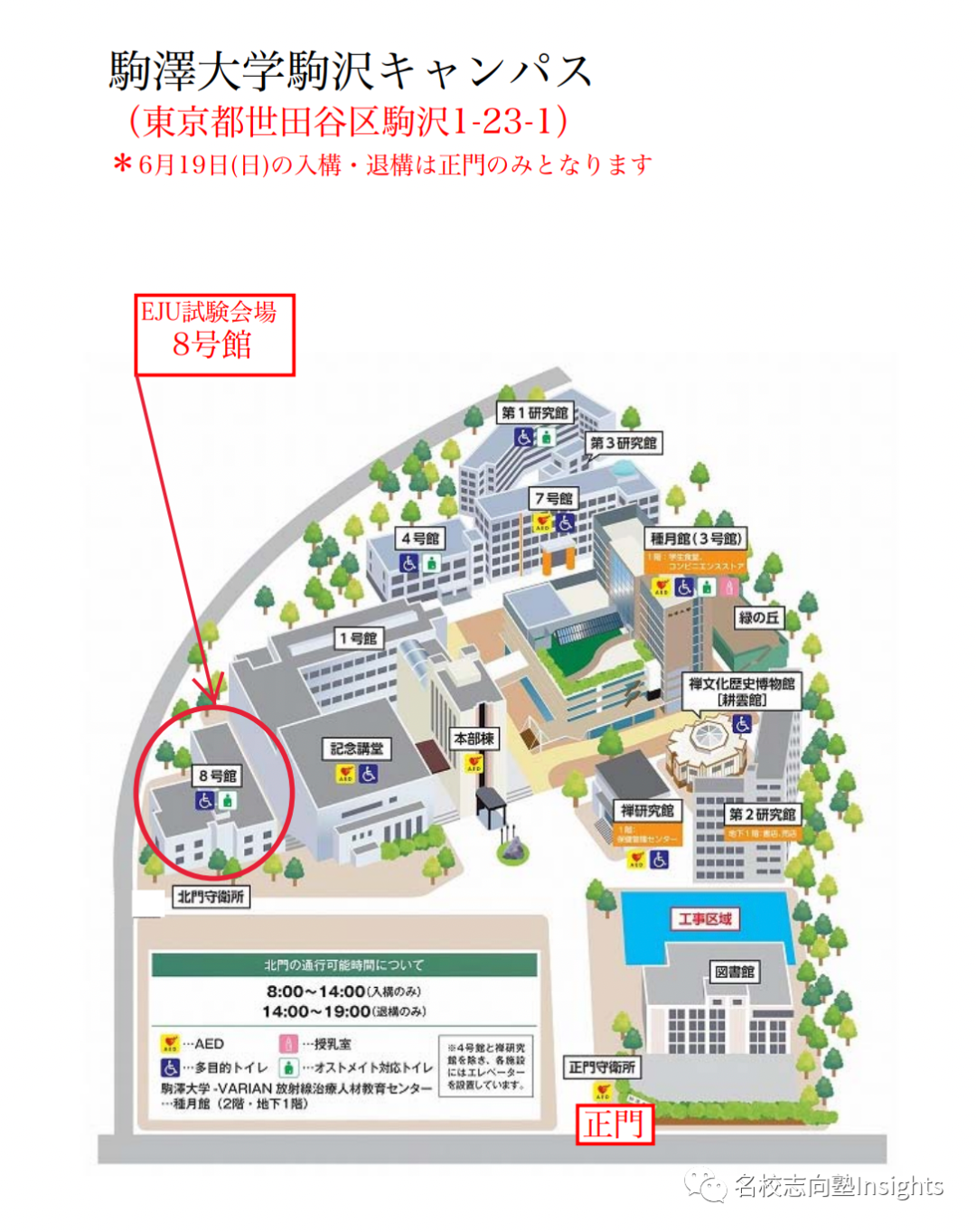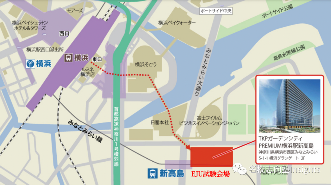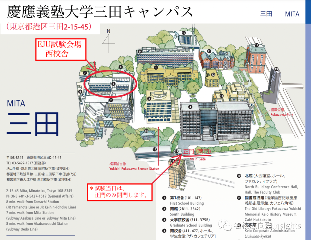 考前 1. 避免考试迟到,记得提前几天去熟悉自己的考场; 2. 日语考试迟到10分钟之后不得入场,综合科目和数学迟到20分钟之后不得入场; 3. 不光是准考证,同样带上护照和在留卡,一旦准考证遗失,可去指定地点补办; 4. 准备双份的HB铅笔和橡皮; 5. 提前熟悉考场周围餐厅和便利店,或者提前备好午饭。中午尽量不要吃油腻不消化的食物,以免影响发挥。 考中 1. 手机关机,关闭所有闹钟; 2. 答题卡图表记得要涂满。 考后 1. 关注名校志向塾Insights公众号,随时查看EJU各类考后应援信息; 2. 和小伙伴吃顿大餐。 名校志向塾Insights团队成员在这里集体祝愿大家赛出水准,马到成功! 考场地址: 東京都港区三田2-15-45 交通方式: ① 在JR山手線/京浜東北線「田町」站下车,走A3出口徒步约8分钟到达三田キャンパス正门。 ② 在都営浅草線/都営三田線「三田」站下车,走A3出口徒步约8分钟到达三田キャンパス正门。 *考试当天只开正门,到站的同学注意不要从A10出口走东门!! 考场: 東京都世田谷区駒沢1-23-1 交通方式: ①在東急田園都市線「駒沢大学」站下车,走「駒沢公園口」徒步约8分钟到达。 ②在JR線「渋谷」站下车,在23号巴士站台换乘東急バス渋82至「駒沢」站下车,徒步约5分钟到达。 ③在JR線「渋谷」站下车,在41号巴士站台换乘東急バス渋12至「駒沢」站下车,徒步约5分钟到达。 *考试当天仅开放大学正门,千万不要走错!! 考场地址: 東京都世田谷区桜上水3-25-40 交通方式: ① 在京王線/東急世田谷線「下高井戸」站下车,徒步约8分钟到达。 ② 在京王線「桜上水」站下车,徒步约8~10分钟到达。 考场地址: 東京都千代田区富士見2−17−1 交通方式: ① JR総武線「市ヶ谷」或「飯田橋」站下车,徒步约10分钟。 ② 東京メトロ有楽町線、南北線「市ヶ谷」或「飯田橋」站下车,徒步约10分钟。 ③ 都営大江戸線東京メトロ東西線「飯田橋」站下车,徒步约10分钟。 ④ 都営新宿線「市ヶ谷」站下车,徒步约10分钟。 考场地址: 東京都新宿区西早稲田1−6−1 交通方式: ① 東京メトロ東西線到「早稲田」站,从3a出口徒步8分钟到达会场*请从南门入场 ② 東京メトロ副都心線到「西早稲田」站,从1番出口徒步18分钟到达会场*请从北门入场 ③ JR山手線、西武新宿線「高田馬場」站下车,从早稻田口徒步约25分钟到达考试会场*请从北门入场 考场: 東京都小金井市中町2-24-16 交通方式: 在JR中央線「東小金井」站下车,走nonowa口徒步约6分钟/南口徒步约8分钟到达东门。 *nonowa出口只能用交通卡,使用车票的同学请走南口!! 考场地址: 東京都国立市中2-1 交通方式: JR中央線「国立」站下车,走南口徒步约10分到达。 考场地址: 埼玉県坂戸市けやき台1-1 交通方式: 在東武越生線「川角」站下车,徒步约10分钟到达。 考场地址: 千葉県千葉市稲毛区弥生町1−33 交通方式: ① JR総武本線「西千葉」站徒步约2分钟到达西千葉キャンパス南门,徒步约5分钟到达考试会场。 ② 京成電鉄千葉線「京成みどり台」站徒步约7分钟到达西千葉キャンパス正门,徒步约5分钟到达考试会场。 考场: 神奈川県横浜市西区みなとみらい5-1-1 横浜グランゲート 2F 交通方式: ①在みなとみらい線「新高島」站下车,走臨港パーク口徒步约1分钟到达。 ②在JR線/東急東横線/京急本線「横浜」站下车,走東口徒步约7分钟到达。 ③在横浜市営地下鉄ブルーライン/相鉄本線「横浜」站下车,徒步约15分钟到达。 考场地址: 群馬県高崎市白銀町9番地白銀ビル2階3階 交通方式: 在JR線「高崎駅」下车,走西口徒步约7分钟到达。
