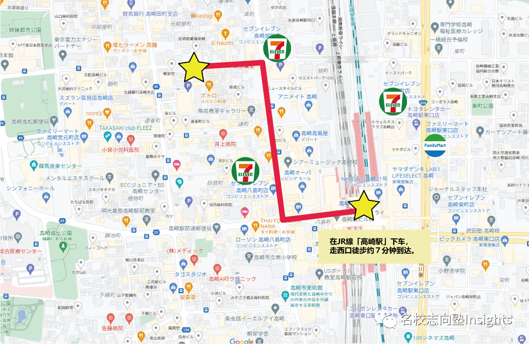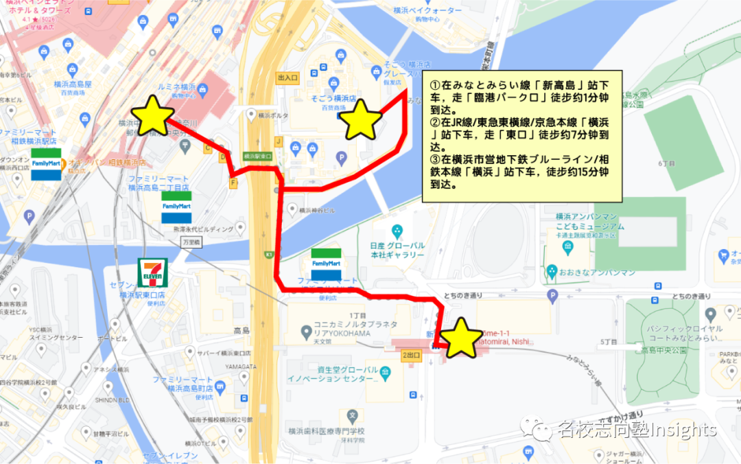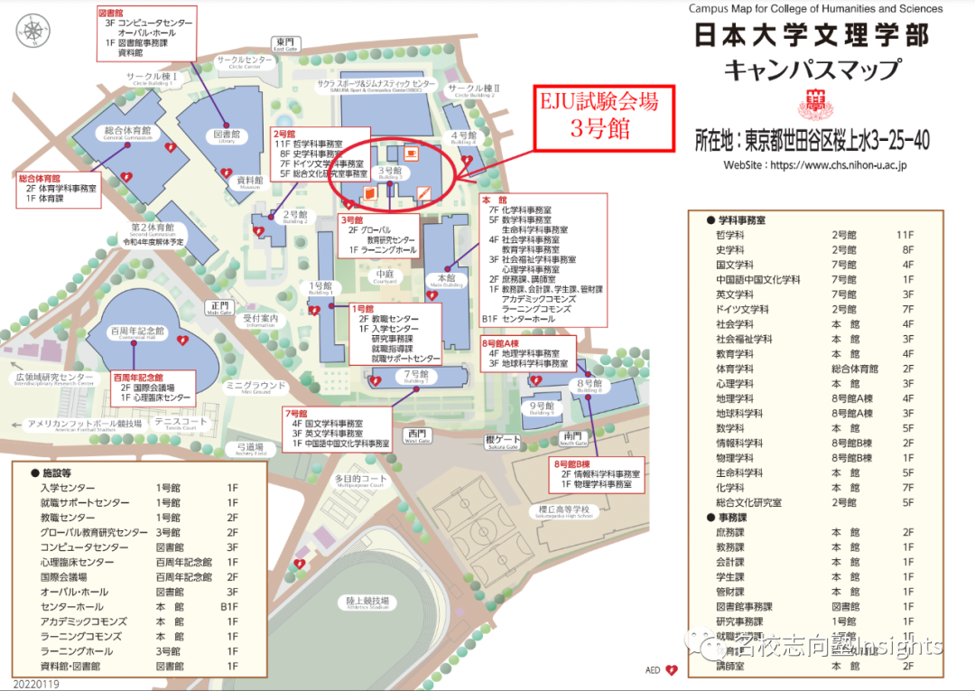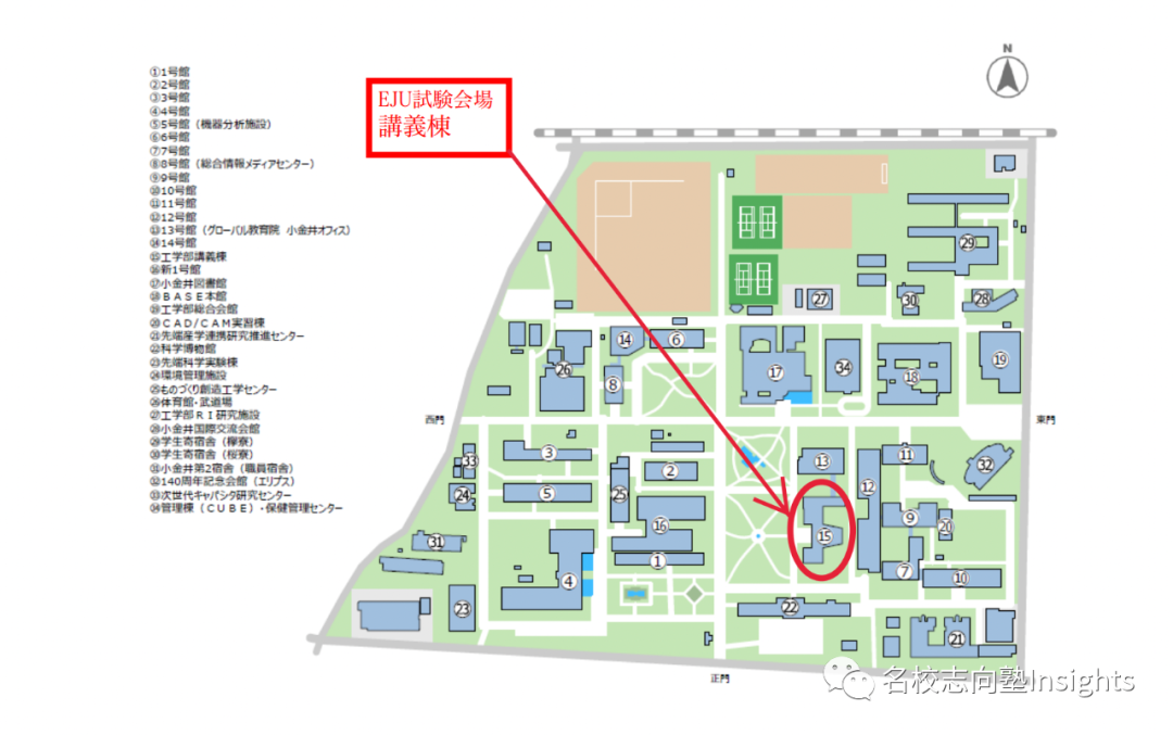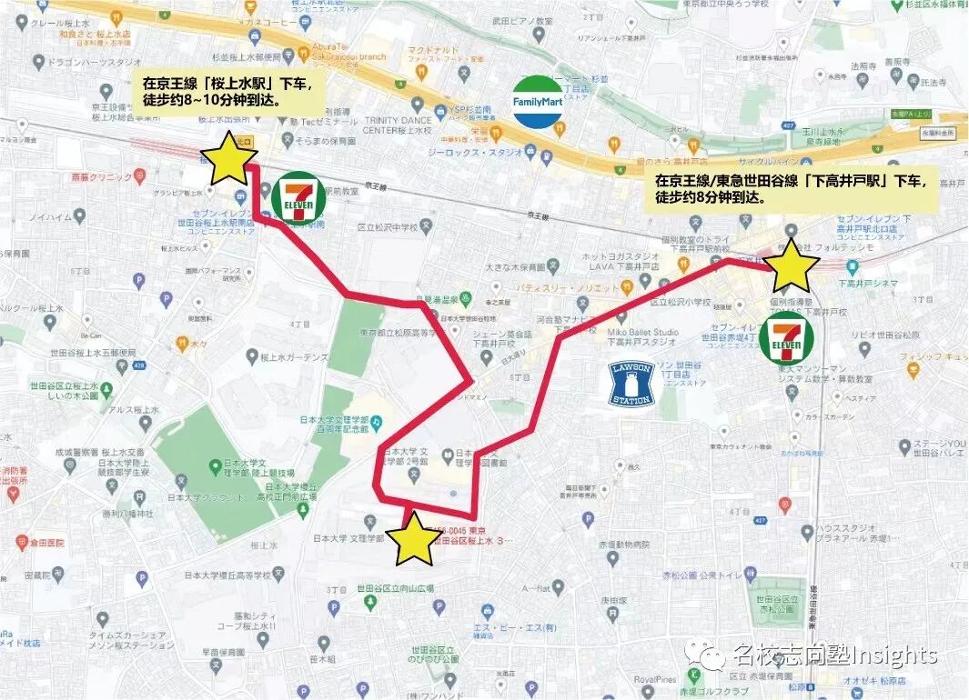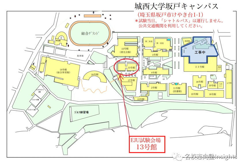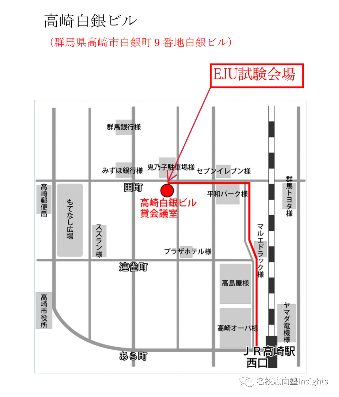 考前 1. 避免考试迟到,记得提前几天去熟悉自己的考场; 2. 日语考试迟到10分钟之后不得入场,综合科目和数学迟到20分钟之后不得入场; 3. 不光是准考证,同样带上护照和在留卡,一旦准考证遗失,可去指定地点补办; 4. 准备双份的HB铅笔和橡皮; 5. 提前熟悉考场周围餐厅和便利店,或者提前备好午饭。中午尽量不要吃油腻不消化的食物,以免影响发挥。 考中 1. 手机关机,关闭所有闹钟; 2. 答题卡图表记得要涂满。 考后 1. 关注名校志向塾Insights公众号,随时查看EJU各类考后应援信息; 2. 和小伙伴吃顿大餐。 名校志向塾Insights团队成员在这里集体祝愿大家赛出水准,马到成功! 考场地址: 東京都港区三田2-15-45 交通方式: ① 在JR山手線/京浜東北線「田町」站下车,走A3出口徒步约8分钟到达三田キャンパス正门。 ② 在都営浅草線/都営三田線「三田」站下车,走A3出口徒步约8分钟到达三田キャンパス正门。 *考试当天只开正门,到站的同学注意不要从A10出口走东门!! 考场: 東京都世田谷区駒沢1-23-1 交通方式: ①在東急田園都市線「駒沢大学」站下车,走「駒沢公園口」徒步约8分钟到达。 ②在JR線「渋谷」站下车,在23号巴士站台换乘東急バス渋82至「駒沢」站下车,徒步约5分钟到达。 ③在JR線「渋谷」站下车,在41号巴士站台换乘東急バス渋12至「駒沢」站下车,徒步约5分钟到达。 *考试当天仅开放大学正门,千万不要走错!! 考场地址: 東京都世田谷区桜上水3-25-40 交通方式: ① 在京王線/東急世田谷線「下高井戸」站下车,徒步约8分钟到达。 ② 在京王線「桜上水」站下车,徒步约8~10分钟到达。 考场地址: 東京都千代田区富士見2−17−1 交通方式: ① JR総武線「市ヶ谷」或「飯田橋」站下车,徒步约10分钟。 ② 東京メトロ有楽町線、南北線「市ヶ谷」或「飯田橋」站下车,徒步约10分钟。 ③ 都営大江戸線東京メトロ東西線「飯田橋」站下车,徒步约10分钟。 ④ 都営新宿線「市ヶ谷」站下车,徒步约10分钟。 考场地址: 東京都新宿区西早稲田1−6−1 交通方式: ① 東京メトロ東西線到「早稲田」站,从3a出口徒步8分钟到达会场*请从南门入场 ② 東京メトロ副都心線到「西早稲田」站,从1番出口徒步18分钟到达会场*请从北门入场 ③ JR山手線、西武新宿線「高田馬場」站下车,从早稻田口徒步约25分钟到达考试会场*请从北门入场 考场: 東京都小金井市中町2-24-16 交通方式: 在JR中央線「東小金井」站下车,走nonowa口徒步约6分钟/南口徒步约8分钟到达东门。 *nonowa出口只能用交通卡,使用车票的同学请走南口!! 考场地址: 東京都国立市中2-1 交通方式: JR中央線「国立」站下车,走南口徒步约10分到达。 考场地址: 埼玉県坂戸市けやき台1-1 交通方式: 在東武越生線「川角」站下车,徒步约10分钟到达。 考场地址: 千葉県千葉市稲毛区弥生町1−33 交通方式: ① JR総武本線「西千葉」站徒步约2分钟到达西千葉キャンパス南门,徒步约5分钟到达考试会场。 ② 京成電鉄千葉線「京成みどり台」站徒步约7分钟到达西千葉キャンパス正门,徒步约5分钟到达考试会场。 考场: 神奈川県横浜市西区みなとみらい5-1-1 横浜グランゲート 2F 交通方式: ①在みなとみらい線「新高島」站下车,走臨港パーク口徒步约1分钟到达。 ②在JR線/東急東横線/京急本線「横浜」站下车,走東口徒步约7分钟到达。 ③在横浜市営地下鉄ブルーライン/相鉄本線「横浜」站下车,徒步约15分钟到达。 考场地址: 群馬県高崎市白銀町9番地白銀ビル2階3階 交通方式: 在JR線「高崎駅」下车,走西口徒步约7分钟到达。