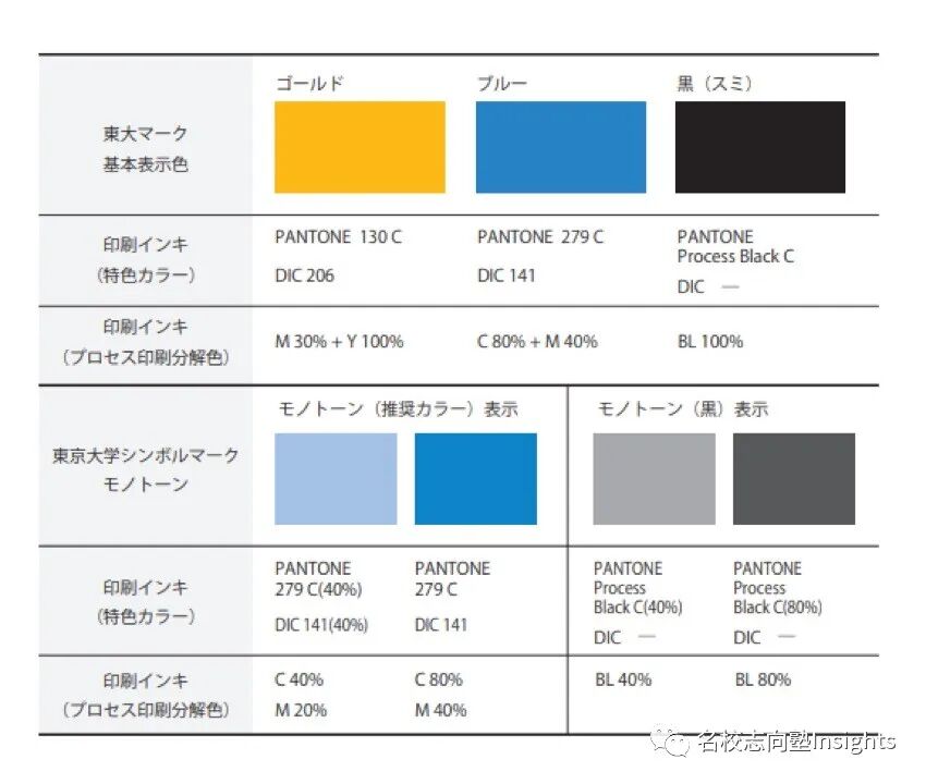 而在制定官方logo时,大学方面同时参考了具有代表意义的银杏徽章与早已广为人知的东大运动会旗帜,最终定下金色与浅蓝两片银杏叶的图案。不过,在印刷限制只能选择单色的情况下,东大规定只允许使用深蓝与浅蓝区分两片银杏。具体颜色参数如下: