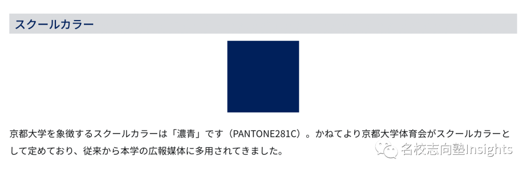 “象征京都大学的校园代表色是深蓝色。自古以来深蓝色就被定为京都大学体育会的代表色,也是本校各宣传媒体的常用色。”