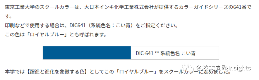 DIC色卡641号色通常被称为「こい青」(深蓝色),但东工大表示,这不够霸气,我要叫它「ロイヤルブルー」(皇家蓝),来代表我校生生不息的跃进与进化!