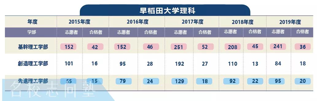 在早大理工学部方面,报考人数最多的无疑是基干理工学部。基干理工学部学科多,合格人数也最多,合格比例可以说是比较理想的。