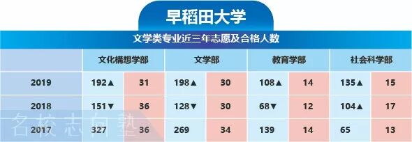 从两所大学的志愿合格人数来看(*蓝框内为志愿人数,红框内为合格人数。下图皆同。),早大文学类专业志愿人数波动剧烈,起伏较大,而合格人数却几乎一直呈直线状发展。