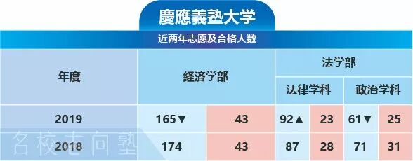 显而易见,政経的人气蒸蒸日上,考学竞争日益激烈;而法学部的报考人数却在2018年遭遇滑铁卢,大幅下挫40%左右。而慶應这三大专业的考学数据还是没有明显的起伏。