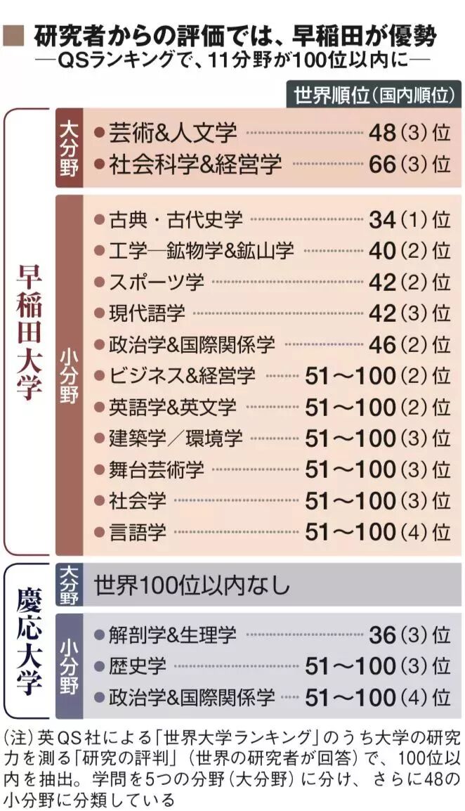 正是得益于如此强势的多元化视角学术加持,所以在最新的QS排名中,早大不仅跻身“芸術&人文学”、“社会科学&経営学”等大分野的前一百位,还揽获了“古典 · 古代史学”、“現代語学”、“英語学&英文学”、“社会学”、“言語学”等诸多小分野的前100名,其中“現代語学”、“英語学&英文学”、“社会学”、“言語学”都是在各个学部出现重复设置的科目(载于《東洋経済》):