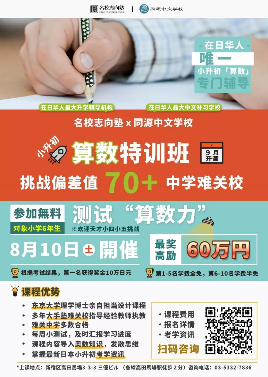 作为在日中国学生有力后盾,名校志向塾联手同源中文学校打造华二代算数教学第一品牌。立志要挑战小升初难关校和志愿校的小六学生,抓住这个机会,挑战更好的自己!