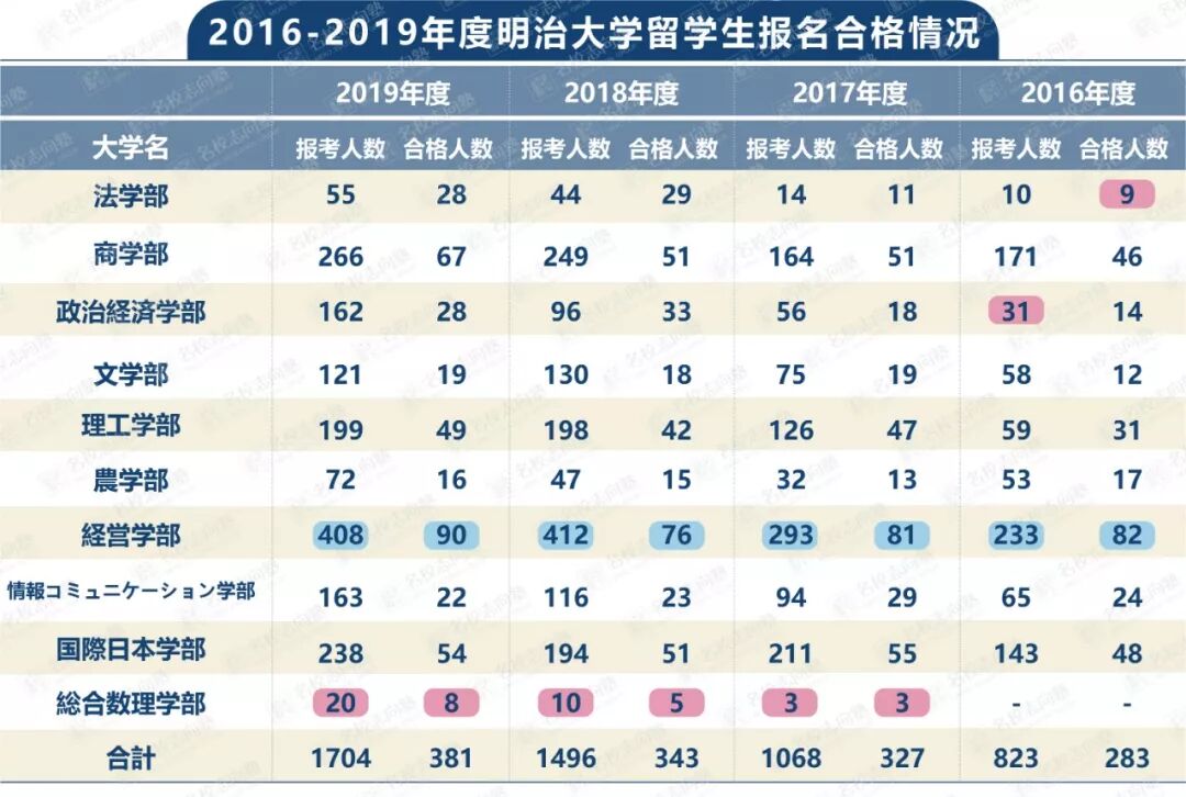 从数据中我们可以看出,明治大学看板学部经营学部是报考热门,经历了18年的大幅突起之后,19年虽稍有所回落,但大体可以看出其在整个合格情况中的重量级地位。