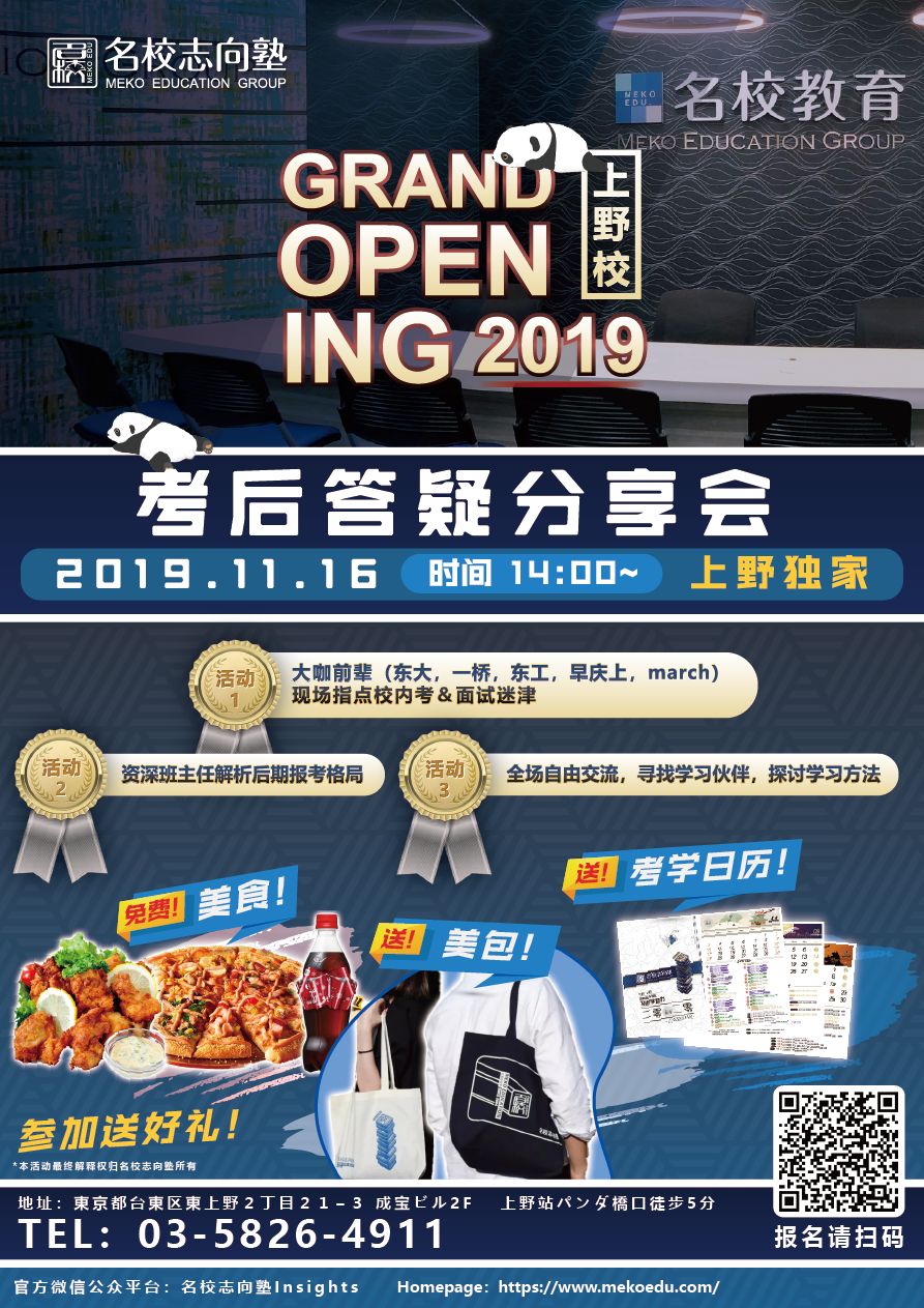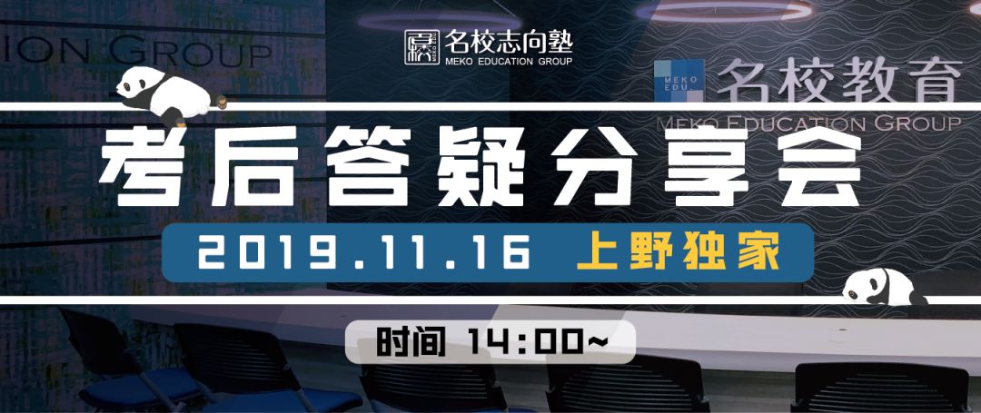 11月16日 名校志向塾将在上野新校盛情举办 留考考后应援活动! 东大、一桥、东工大、早大、March各路大咖前辈 现场答疑解惑 以亲身考学经验直击各位考学重点难点 一扫校内考种种雷区!! 富有多年报名经验的班主任、 面试指导老师也将亲临现场帮你 科学排序志愿校 还原真实面试场景 全力解析校内考备考方向 从根本上助力校内考,直击合格!!